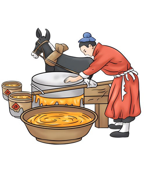 • 將炒好的芝麻用石磨磨成芝麻醬。芝麻醬磨的越細越好,使油料細胞充分破裂,以便取出油脂。